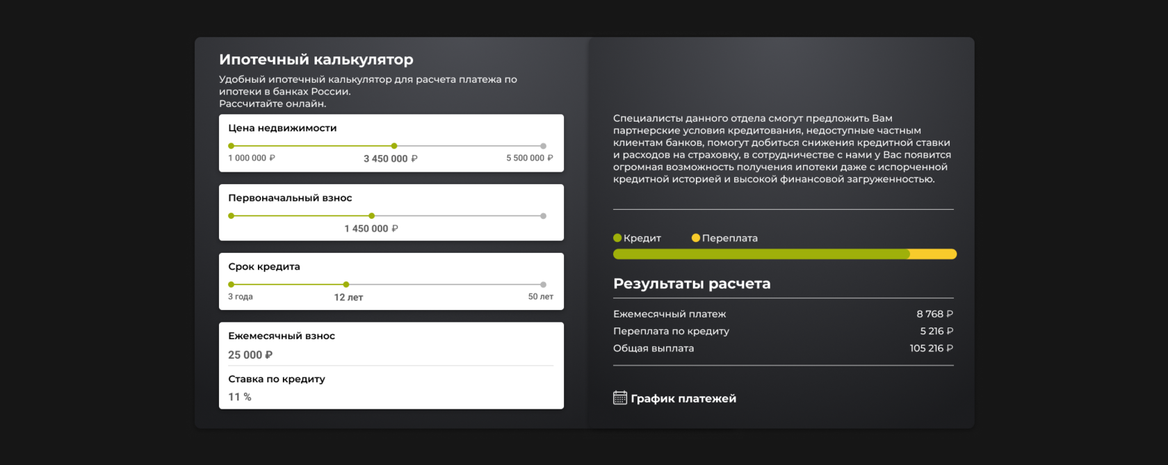 Удобный ипотечный калькулятор для расчета платежа по ипотеки в банках России.